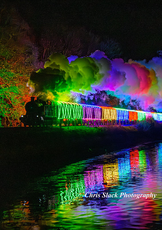 The 2025 Christmas Train of Lights running alongside the River Dart, near Kingswear.